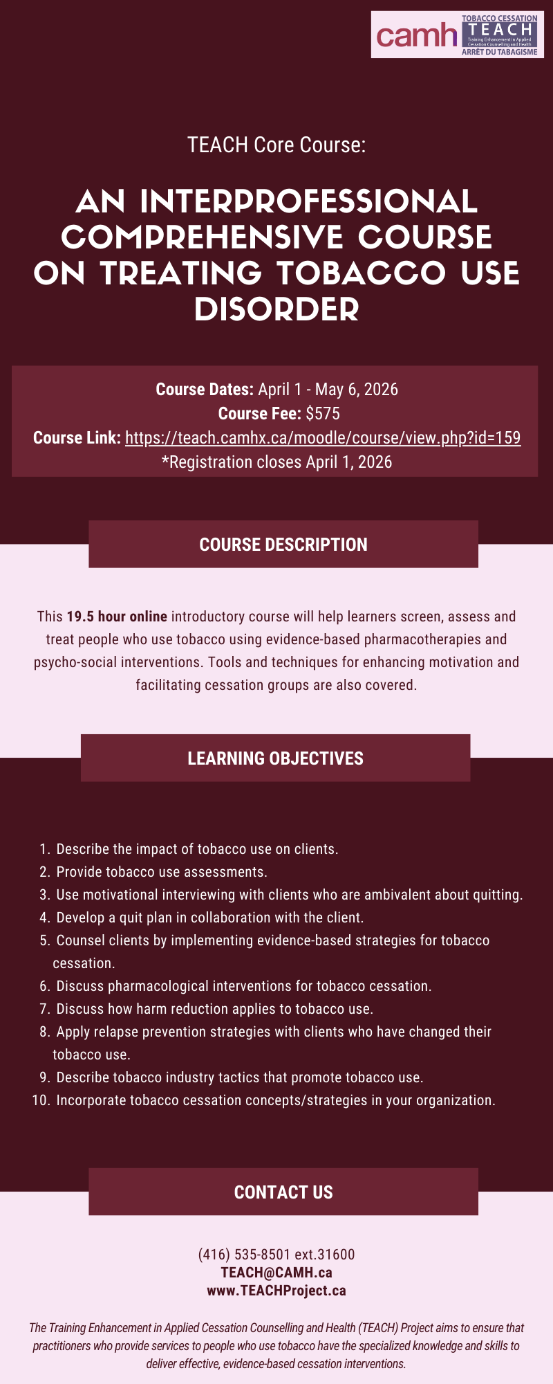 TEACH Core Course: An Interprofessional Comprehensive Course on Treating Tobacco Use Disorder is a 19.5-hour online introductory course offered by the TEACH Project at the Centre for Addiction and Mental Health (CAMH).