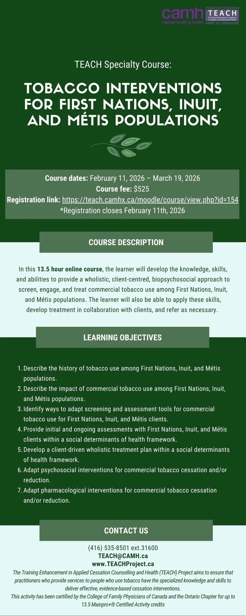 In this 13.5 hour online course, the learner will develop the knowledge, skills, and abilities to provide a holistic, client-centred, biopsychosocial approach to screen, engage, and treat commercial tobacco use among First Nations, Inuit, and Métis populations. The learner will also be able to apply these skills, develop treatment in collaboration with clients, and refer as necessary.